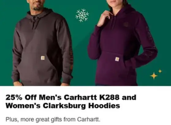 Hurry in & save! Shop in store and get 25% off men's Carhartt K288 and women's Clarksburg hoodies. Plus, more great gifts from Carhartt.